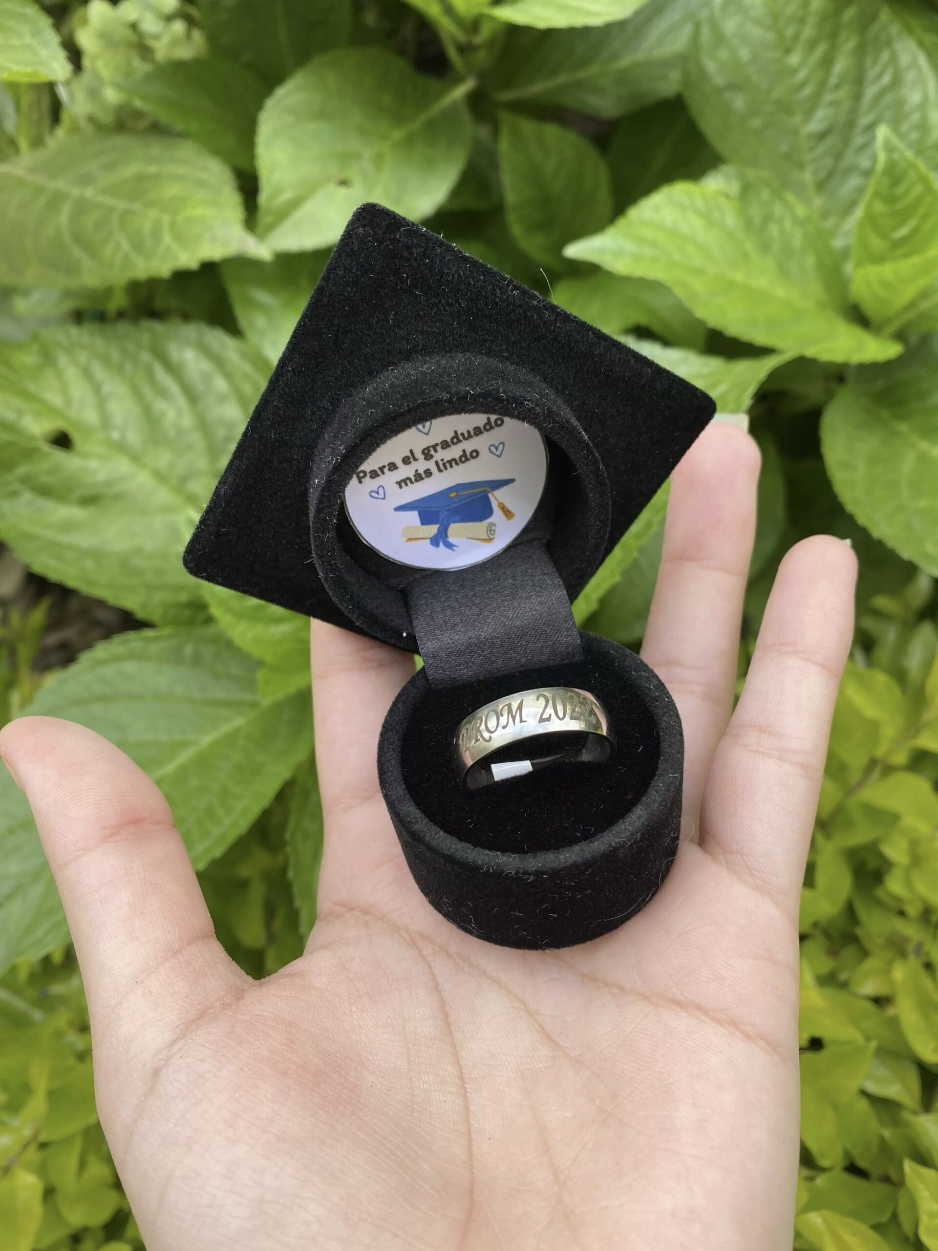 Incluye caja de regalo, tarjeta personalizada, dulces de cortesía, cofre de birrete, argolla personalizada en acero inoxidable.