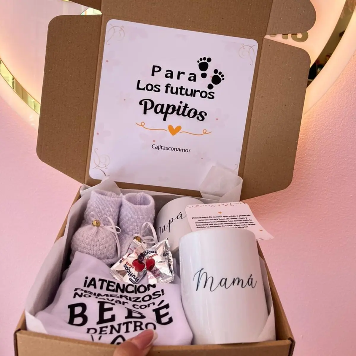 Incluye caja de regalo, decoración, mensaje personalizado, 2 posillos personalizados, body de bebé personalizado, zapatos de bebé, dulces de cortesía