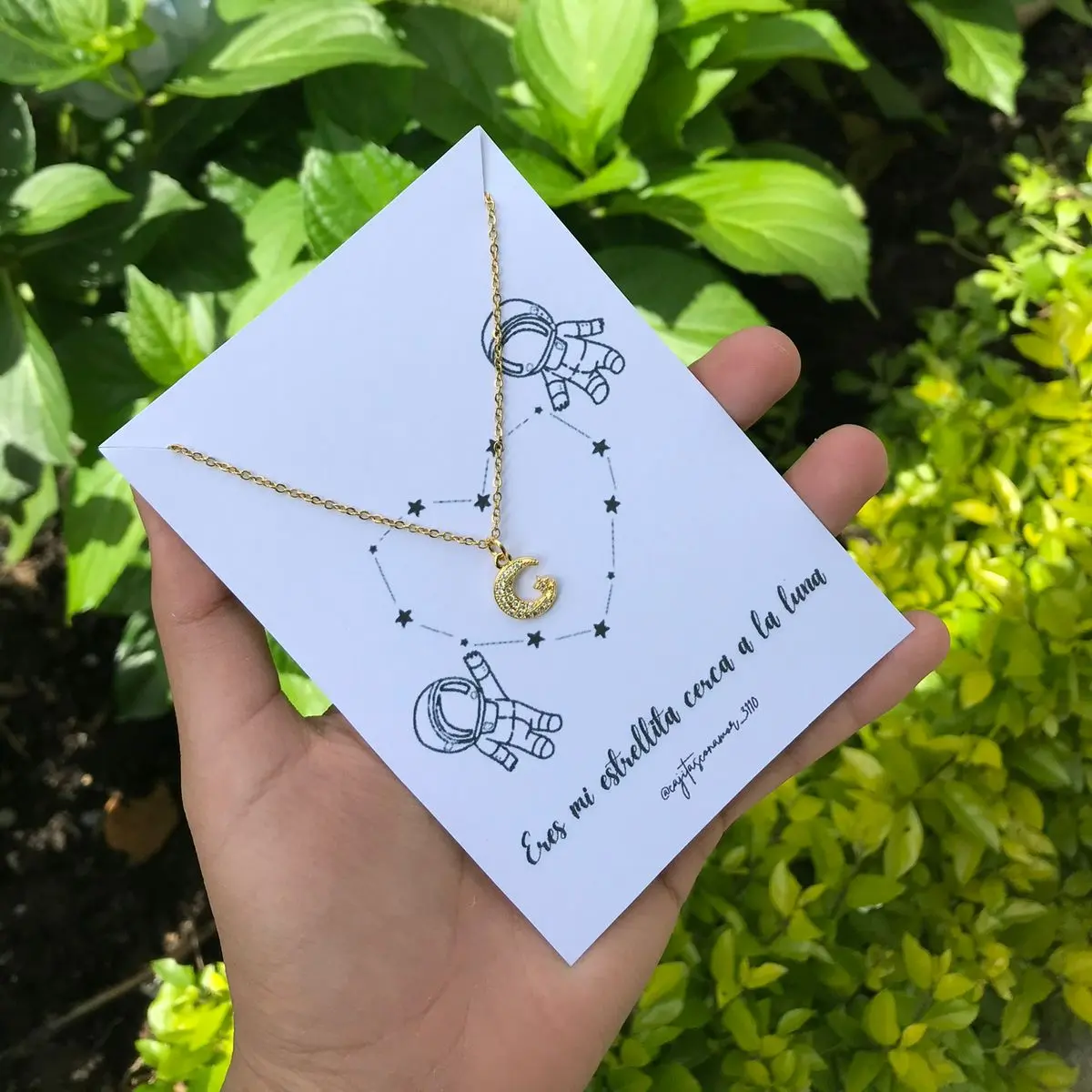 Incluye caja de regalo, decoración, tarjeta personalizada, cadena en acero inoxidable, dije de luna y estrella, dulces de cortesía.