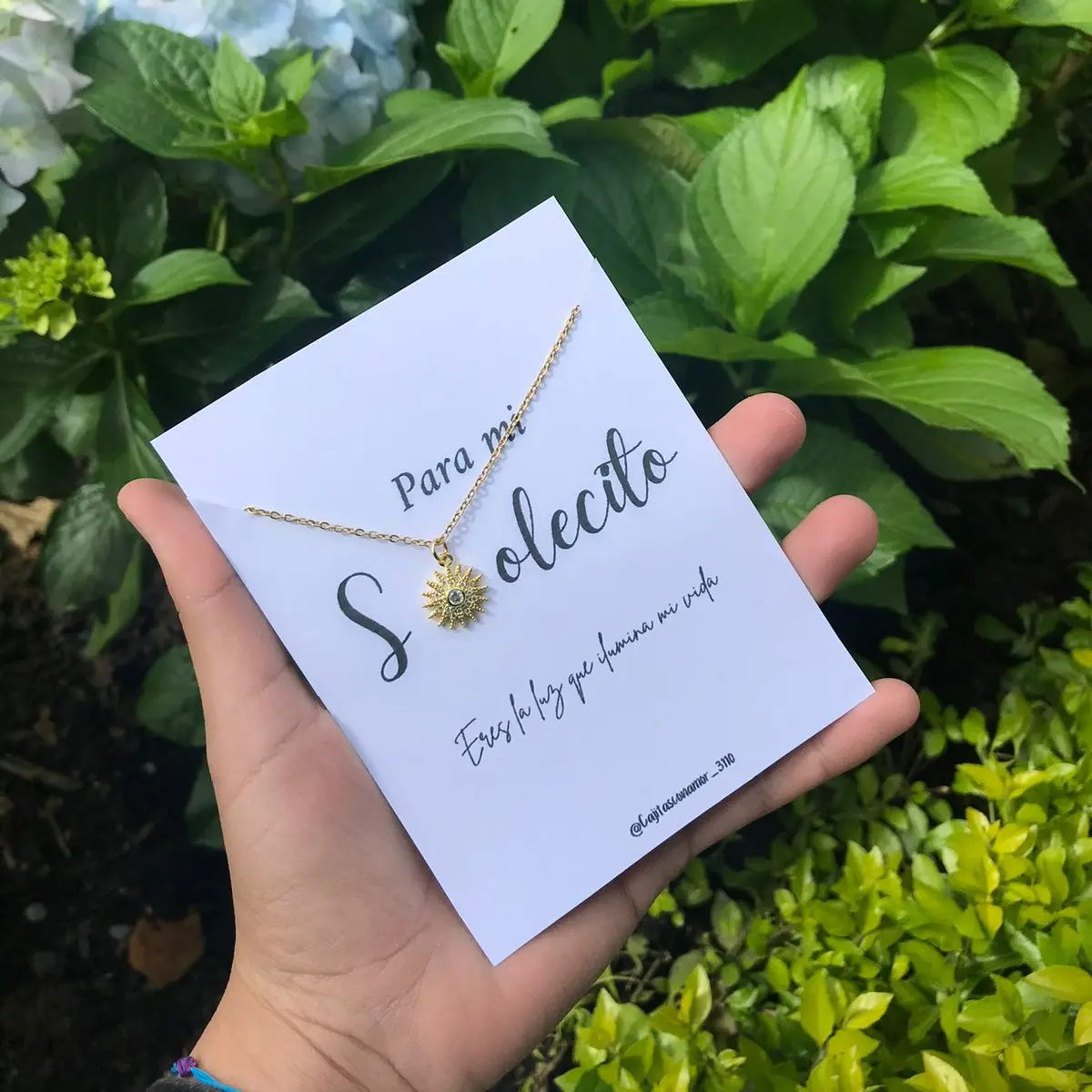Incluye caja de regalo, decoración, tarjeta personalizada, cadena en acero inoxidable, dije de sol, dulces de cortesía.
