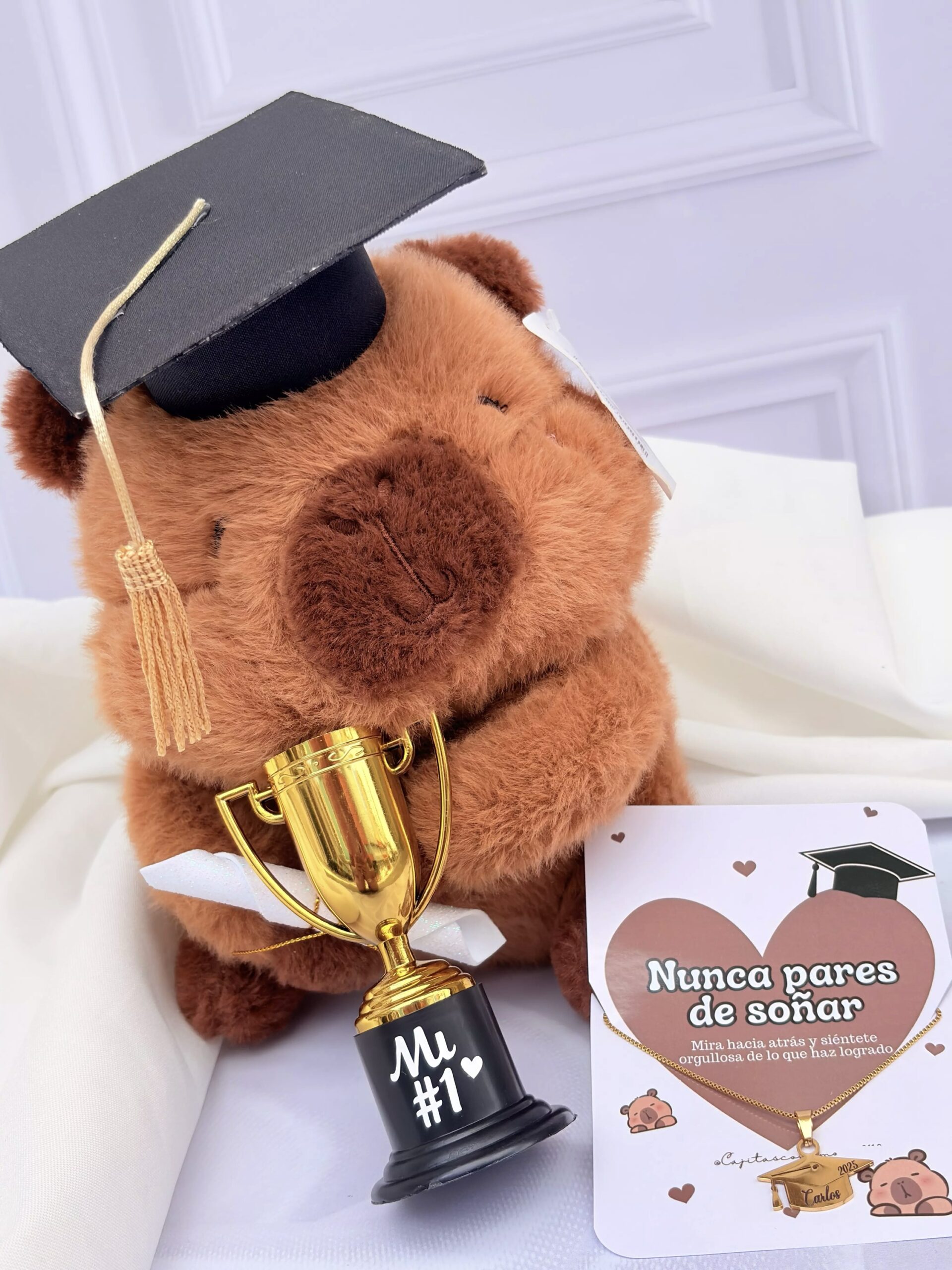 Incluye caja de regalo, decoración, peluche con birrete y diploma, tarjeta personalizada, cadena de birrete personalizada con nombre en acero inoxidable, trofeo personalizado, dulces de cortesía