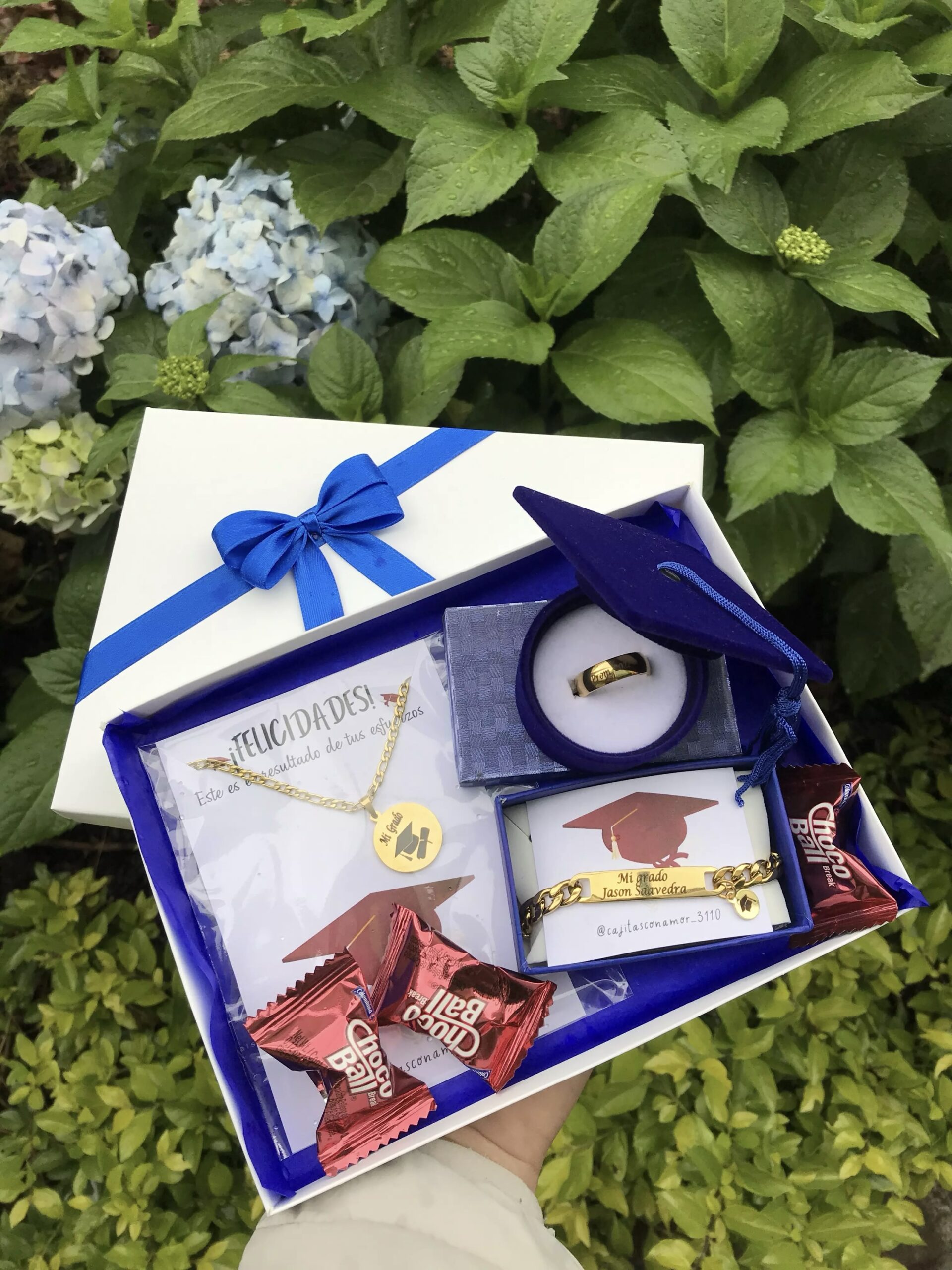 Incluye caja de regalo, tarjeta personalizada, cofre de birrete, estuche para manilla, esclava personalizada en acero inoxidable, argolla, cadena personalizada, dulces de cortesía.