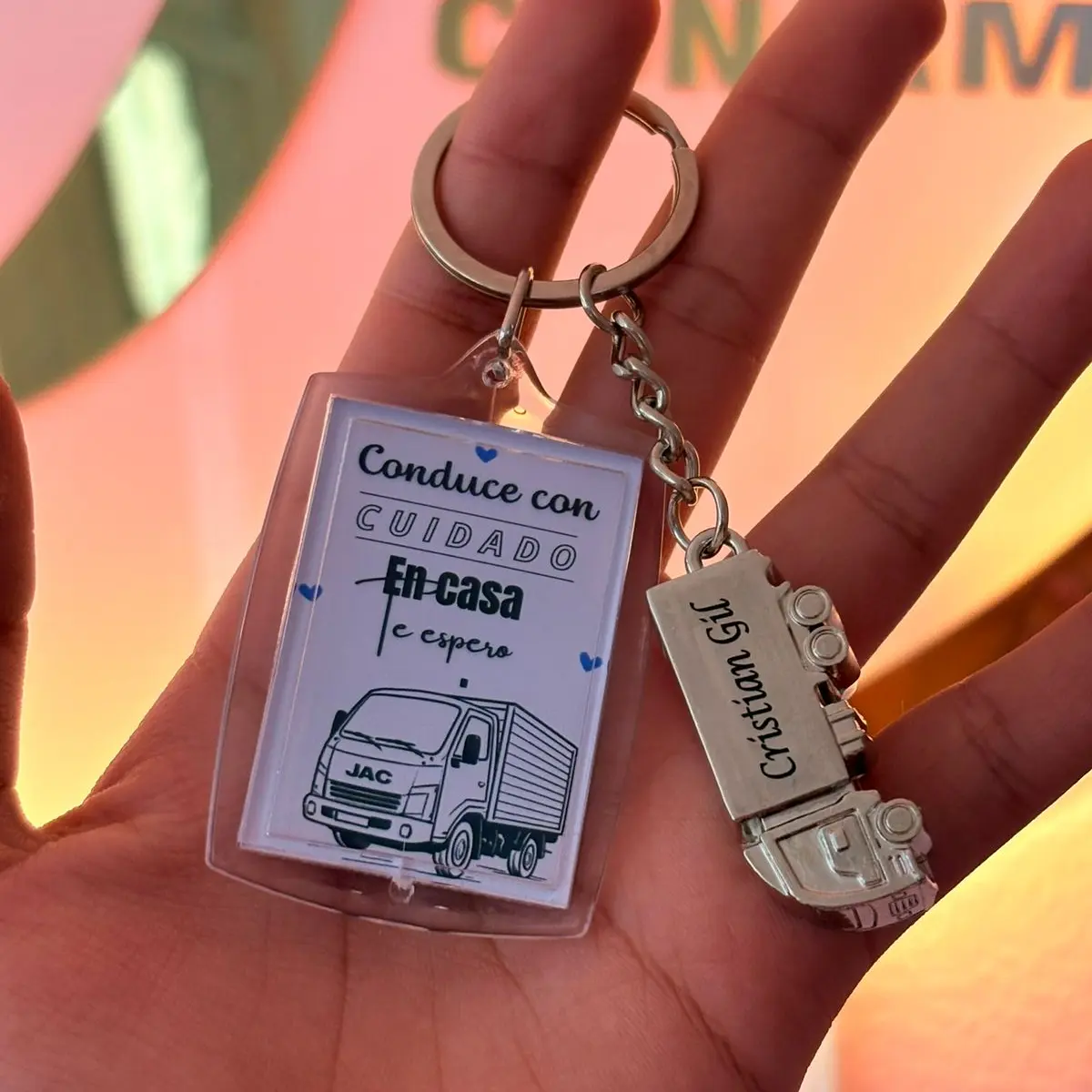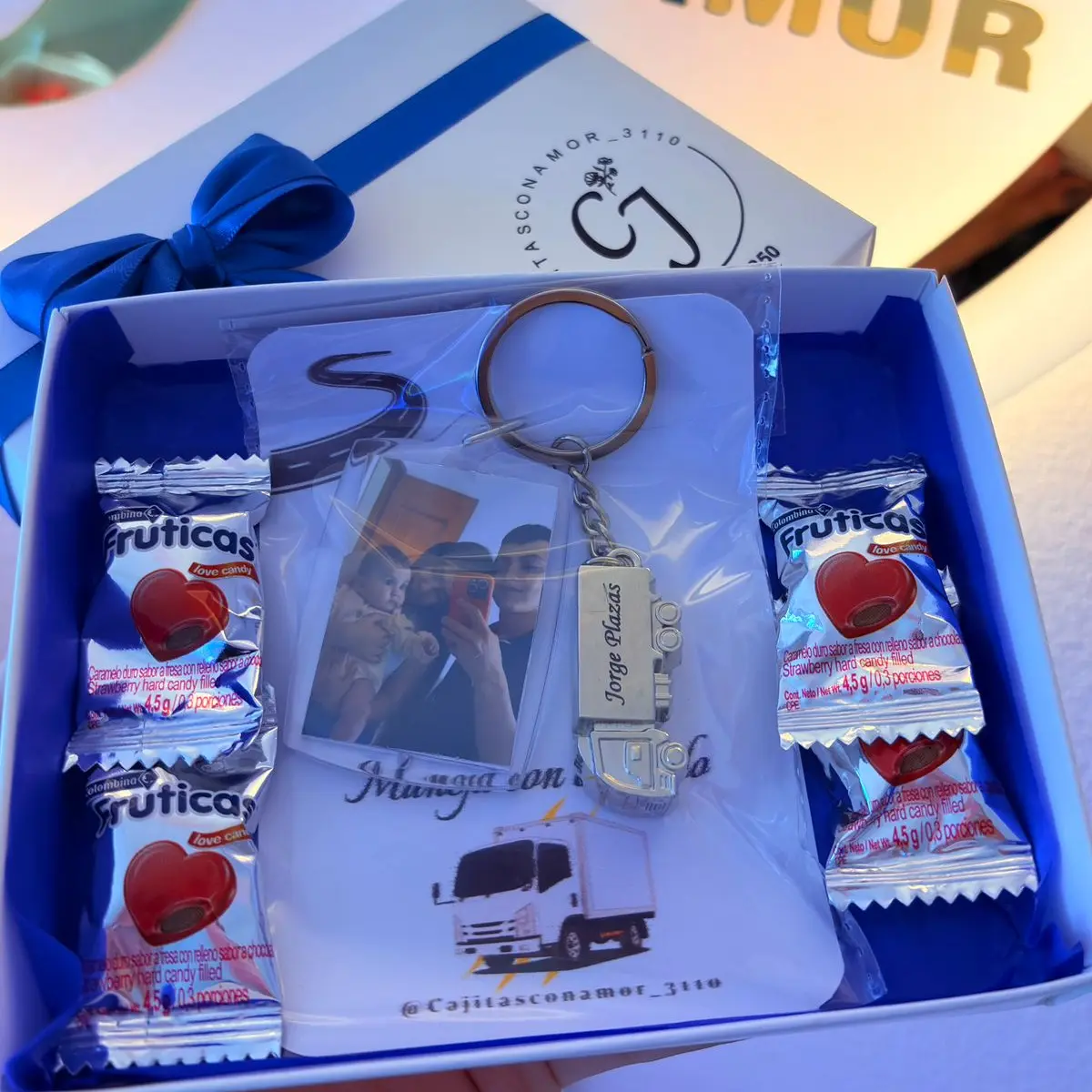 Incluye caja de regalo, decoración, tarjeta personalizada, llavero en acrílico personalizado con frase y foto en la parte de atrás, camión, grabado a láser personalizado, dulces de cortesía