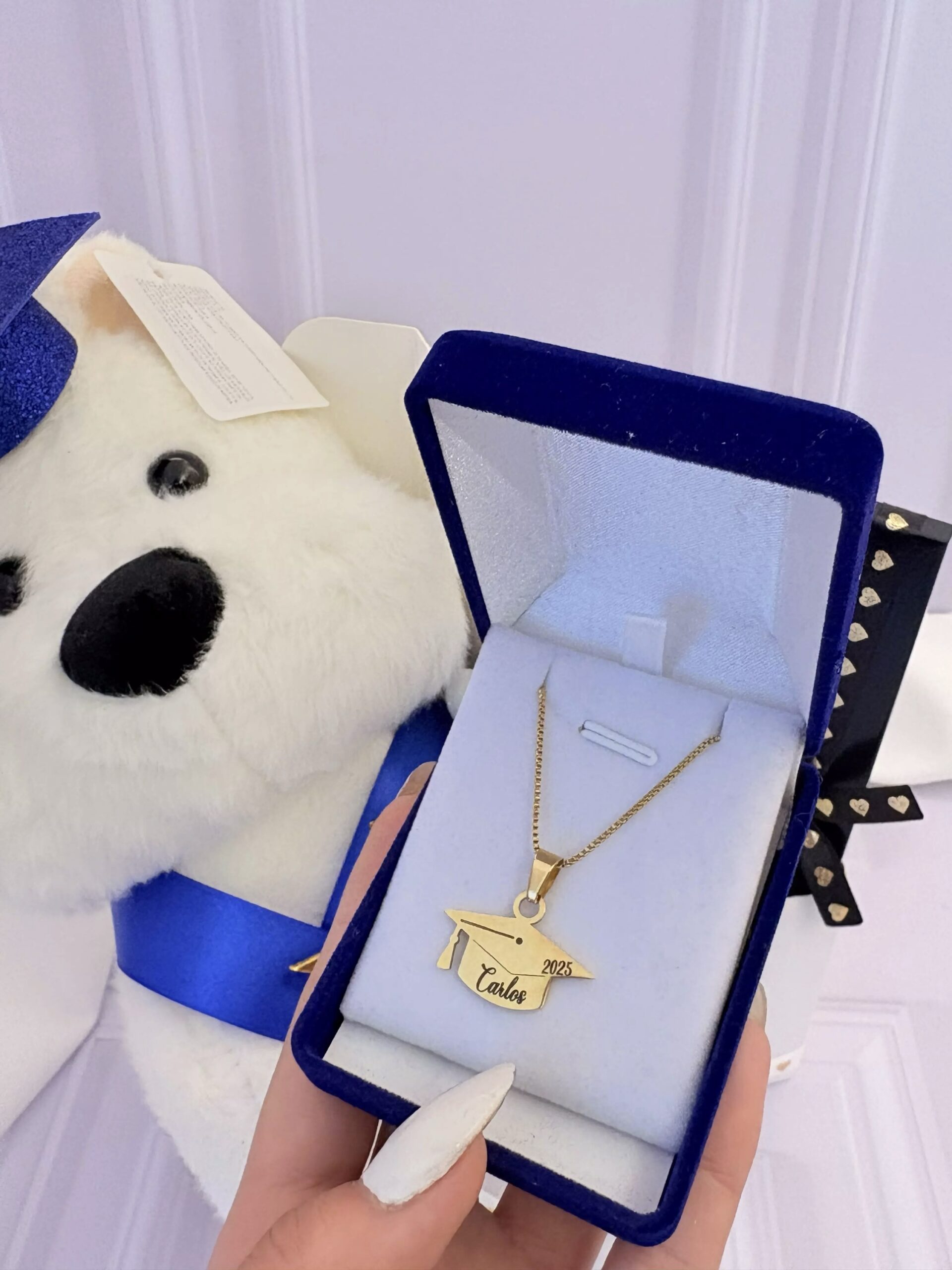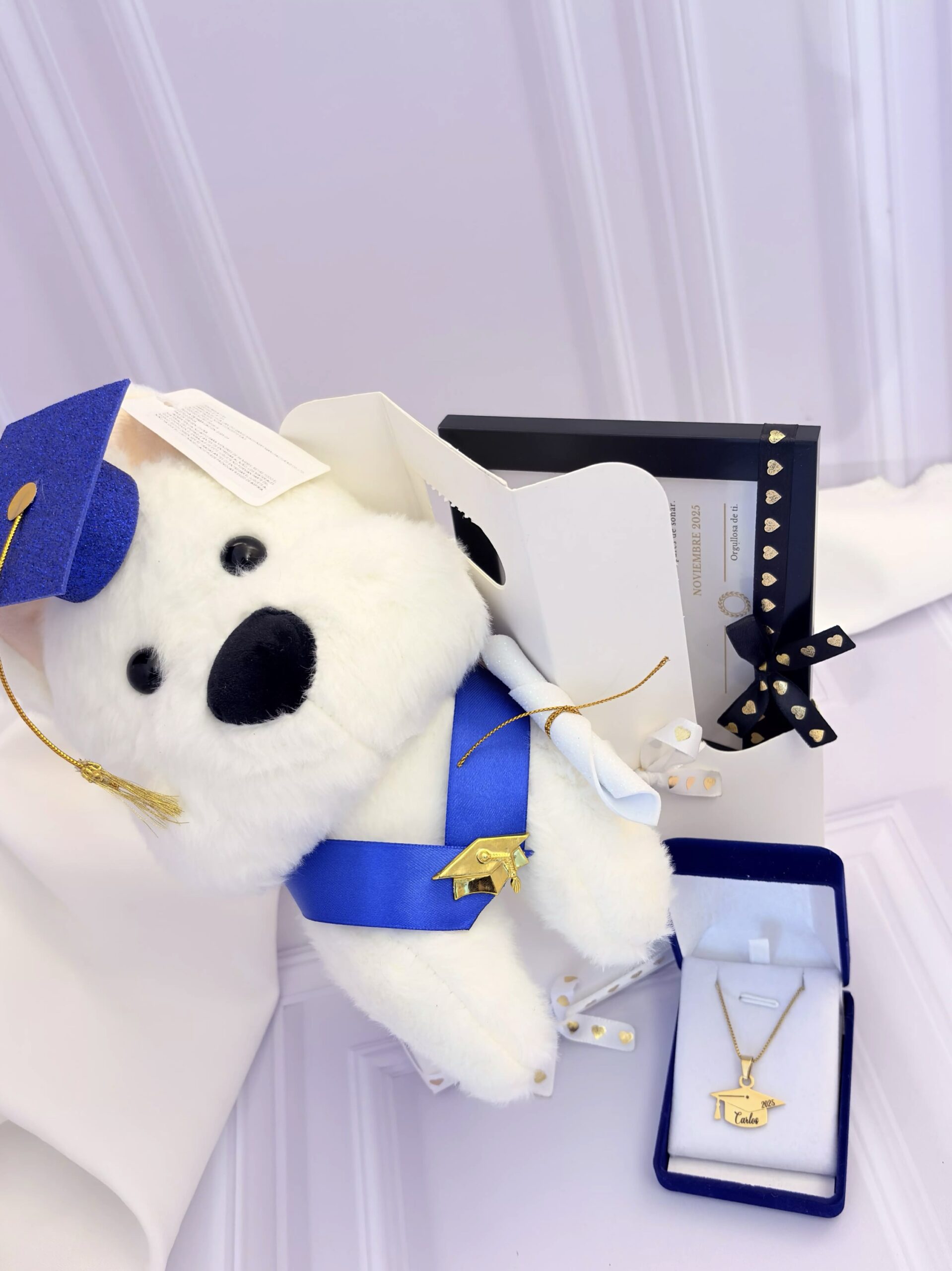 Incluye peluche de perro con birrete, toga y diploma, certificado personalizado con marco, cofre, cadena de birrete personalizada con nombre en acero inoxidable, dulces de cortesía.
