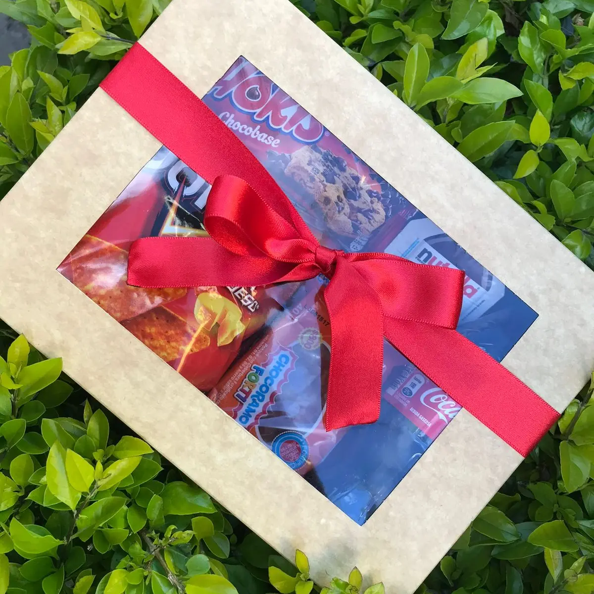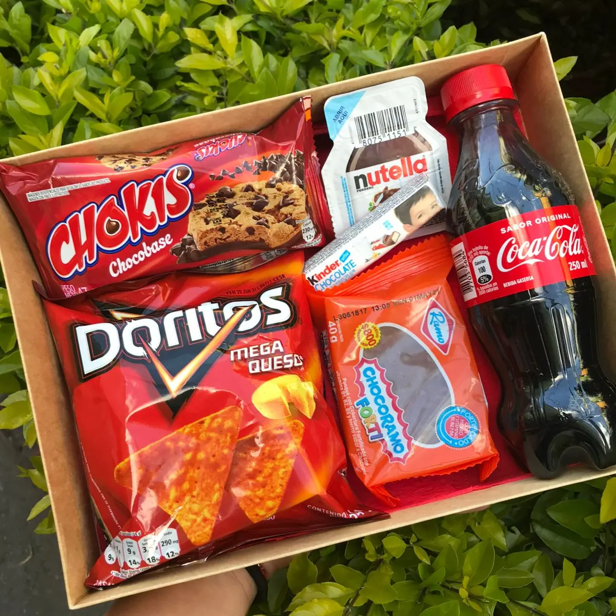 Incluye caja de regalo, decoración, tarjeta personalizada, paquete de doritos, chocorramo mediano, nutella mini, chocolatina kinder mini, galletas chokis, gaseosa pequeña cocacola.
