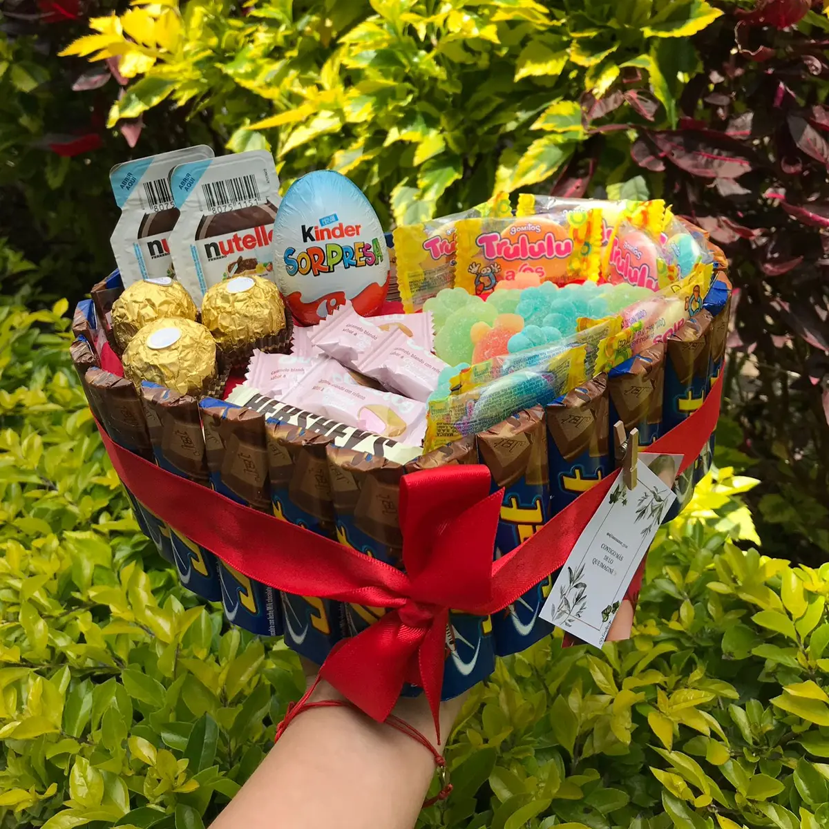 Incluye corazón con 26 chocolatinas jet grande alrededor, 2 nutellas mini pequeñas, 1 huevo kinder con sorpresa, 1 hershey’s mini, 3 chocolates Ferreros, 10 gomitas aros trululu, 10 gomas de tortuga, 4 dulces masticables, tarjeta y foto personalizada.