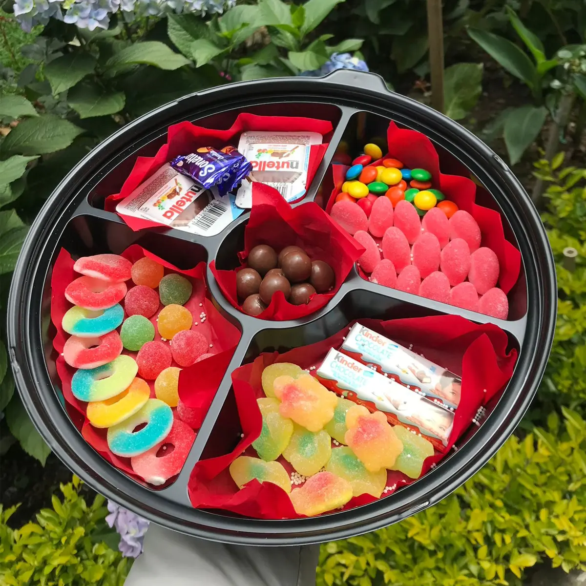 Incluye bandeja dulcera, 2 nutellas mini, gomitas aros trululu, gomitas tortugas, gomitas fresas trululu, 2 chocolatinas kinder, chocolates M&M y tarjeta personalizada o foto.