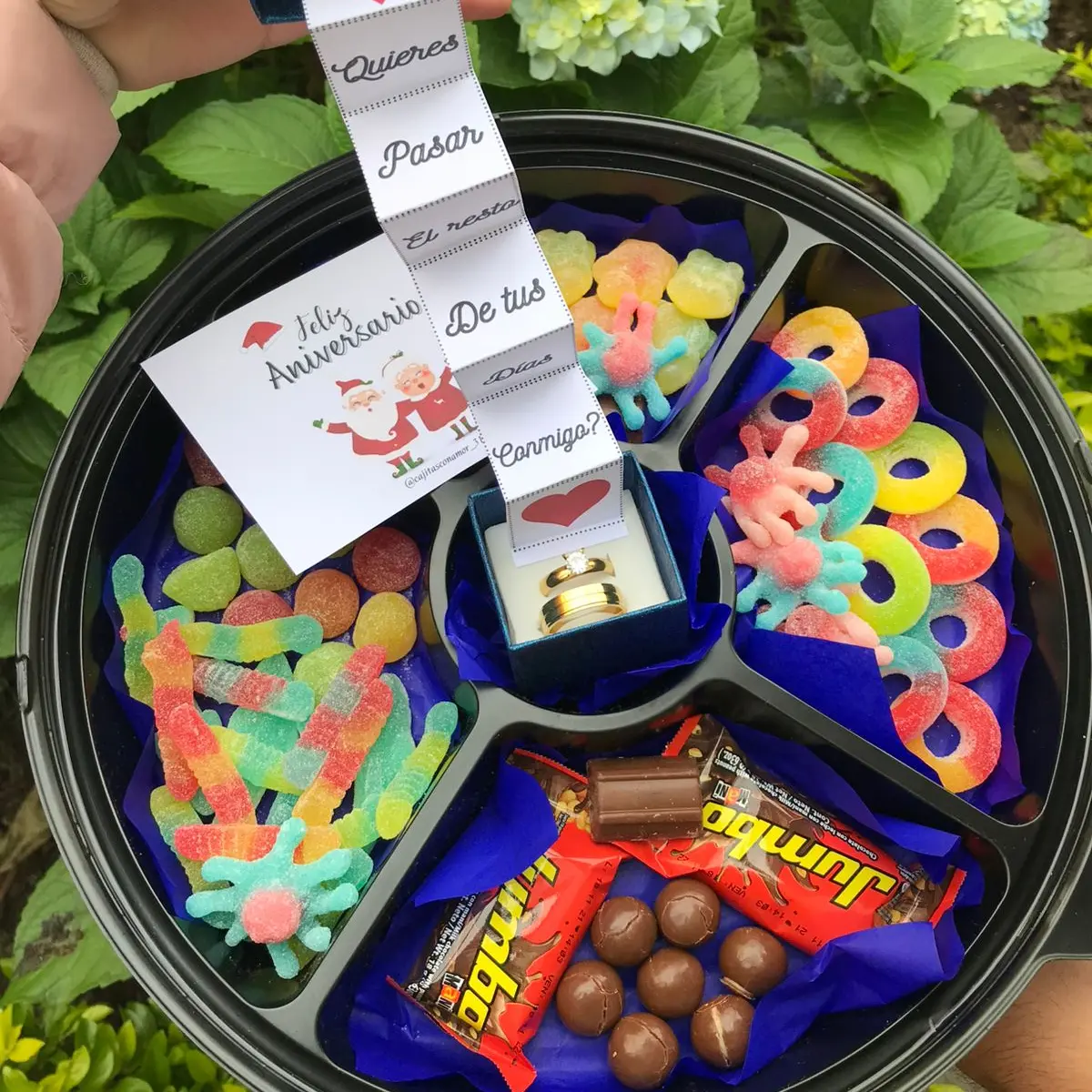 Incluye bandeja dulcera, 3 espacios rellenos de gomitas entre aros, tortugas, gusanos, clásicas, 2 chocolatinas jumbo mini, anillos promesa (puedes escogerlos), caja de anillos con mensaje desplegable, tarjeta personalizada.