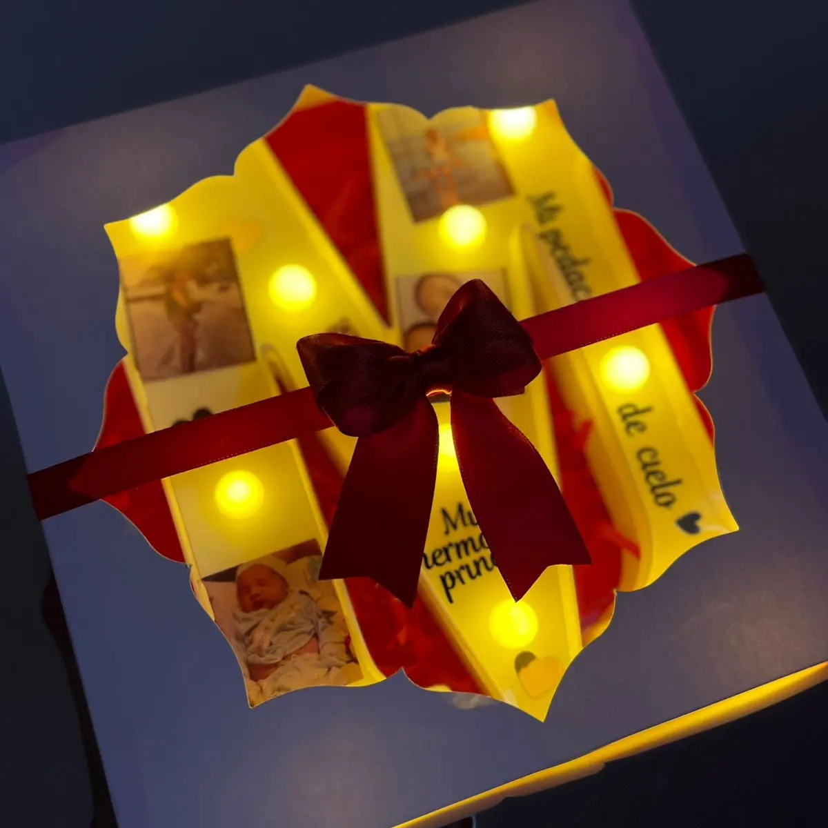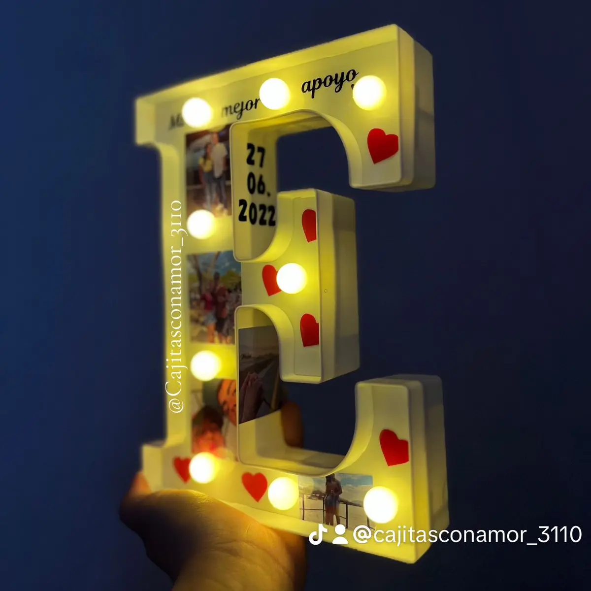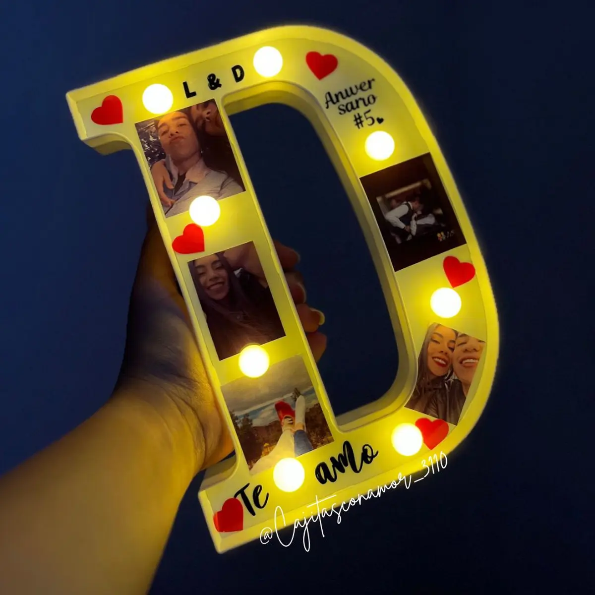 Incluye caja de regalo, decoración, tarjeta personalizada, letra led personalizada, 5 o 6 fotos personalizadas, 2 frases cortas (ej: iniciales, fechas, apodos) y dulces de cortesía.