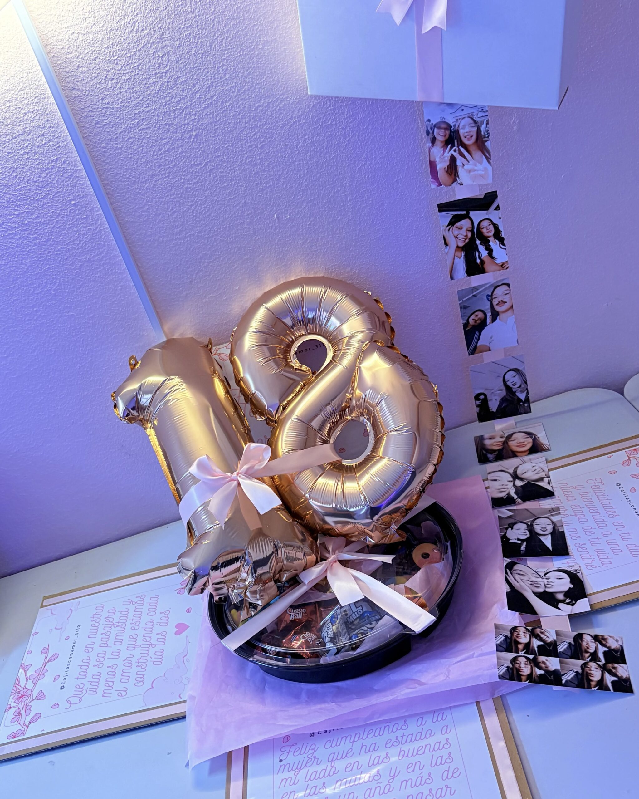 Incluye caja de regalo, decoración, 4 mensajes personalizados, bandeja dulcera con 5 espacios rellenos de gomitas y chocolates, 7 fotos personalizadas colgantes, número en globos metalizados.