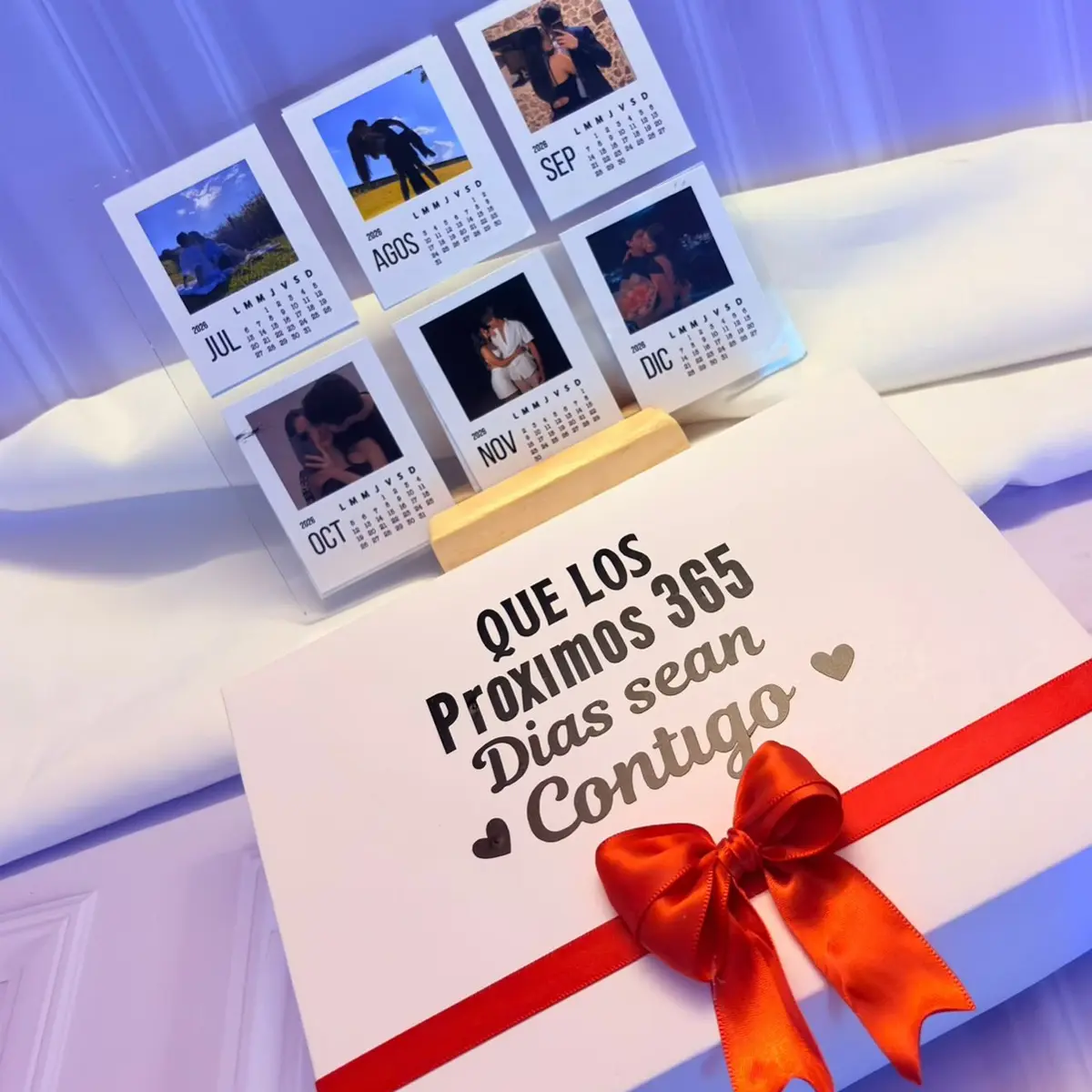 Incluye caja de regalo, decoracion, 12 fotos personalizadas por cada mes, portaretratos en vidrio, base en madera, dulces de cortesía