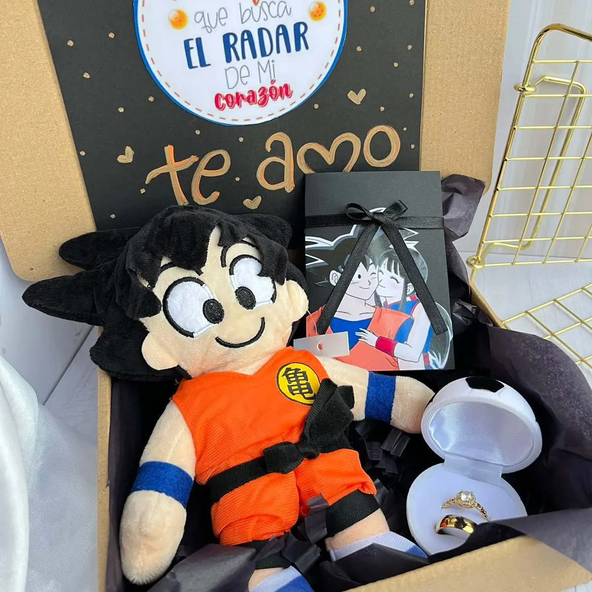 Incluye caja de regalo, decoración, tarjeta personalizada, frase personalizada, peluche de goku, anillos promesa, cofre de anillos, dulces de cortesía.