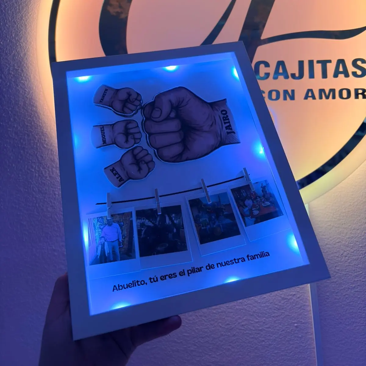 Incluye caja de regalo, decoración, tarjeta personalizada, luz led, portaretratos en madera personalizado con 4 puños, 4 fotos, dulces de cortesía.