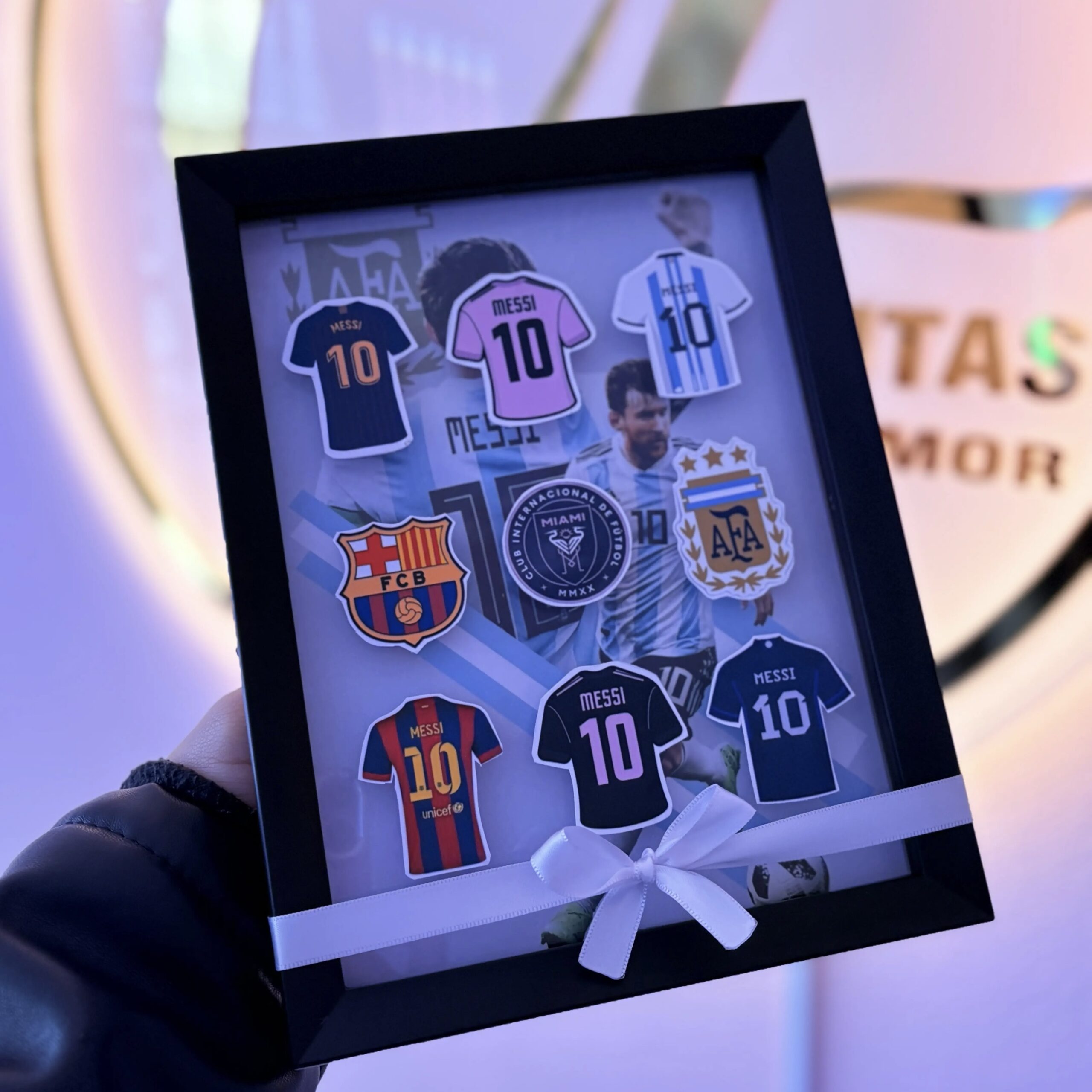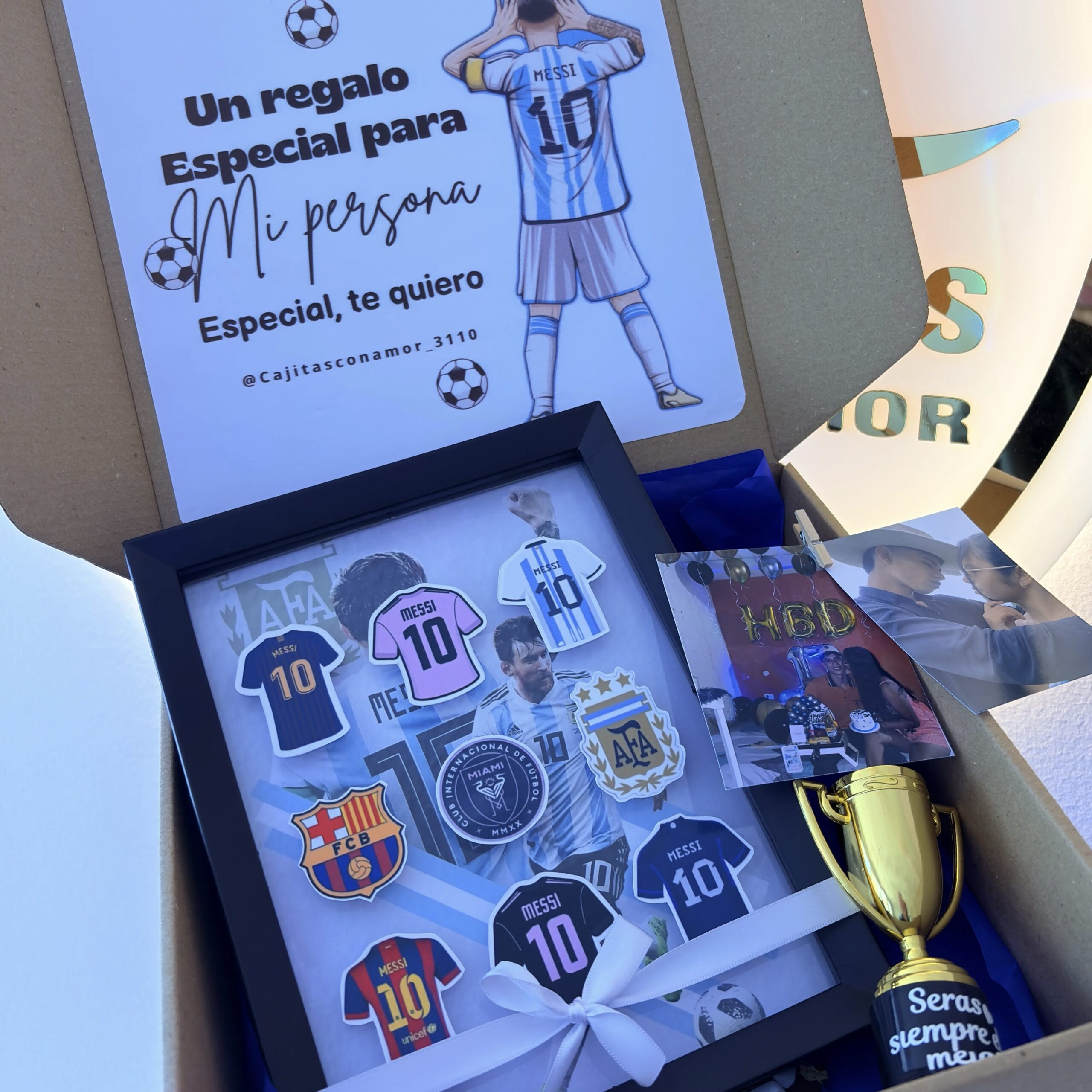 Incluye caja de regalo, decoracion, mensaje personalizado, portarretratos personalizado del equipo (cualquier equipo), trofeo personalizado, 2 fotos personalizadas, 2 chocolatinas jet mini.