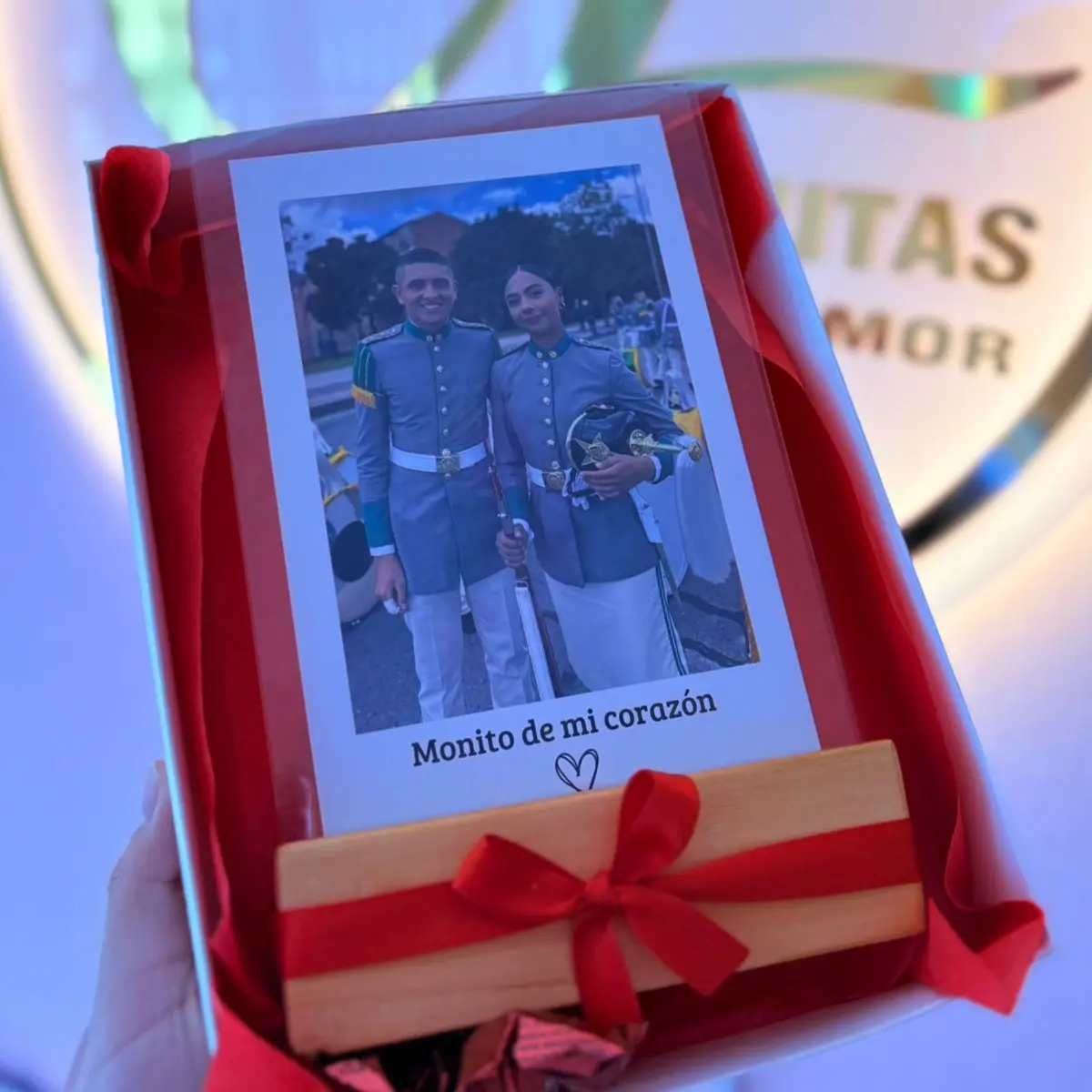 Incluye caja de regalo, decoración, portaretratos doble vidrio, base en madera, personalizado con foto y frase, dulces de cortesía.