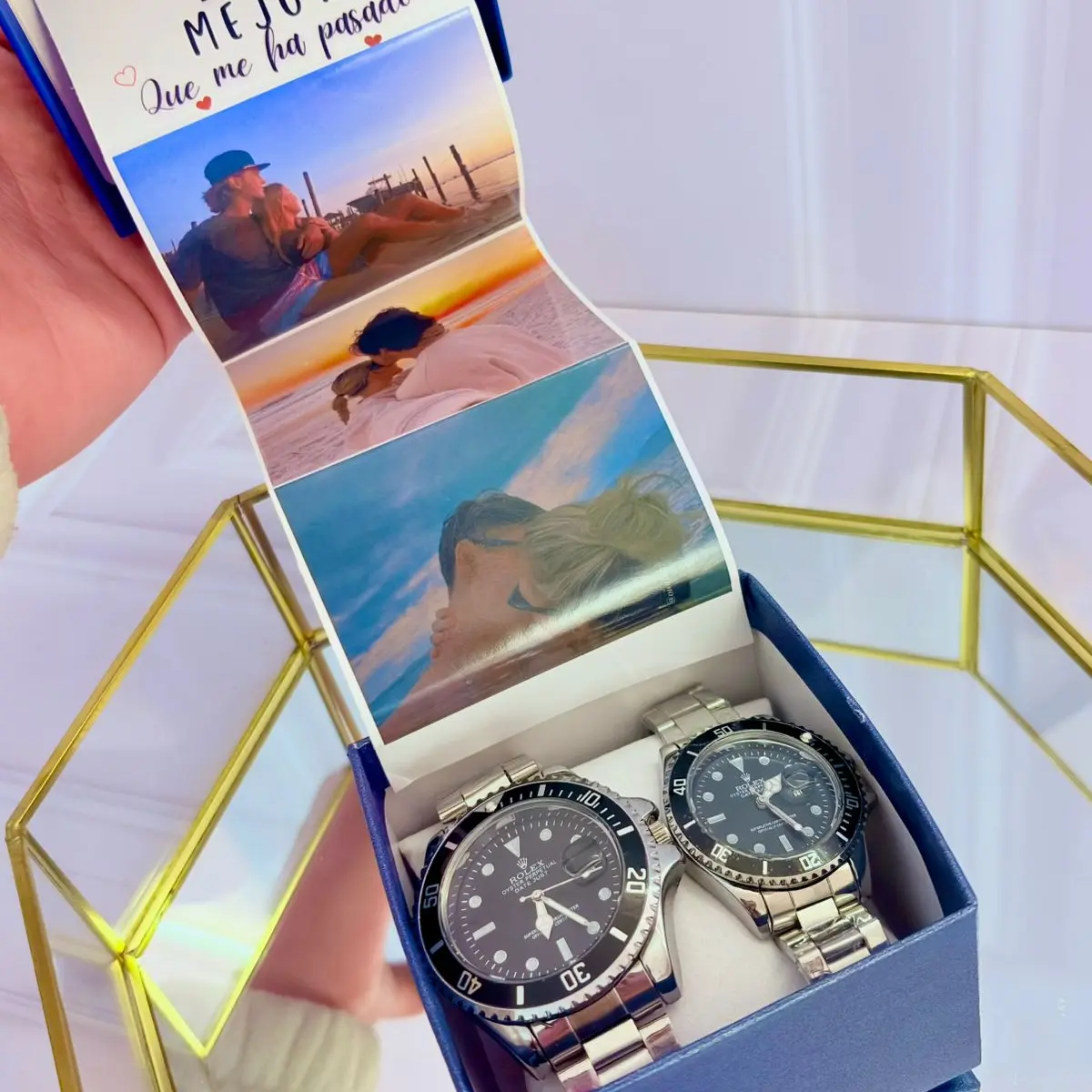 Incluye caja de regalo, tarjeta personalizada, caja para relojes, pareja de relojes replica Rolex con calendario, 3 fotos personalizadas, dulces de cortesía. Material: Acero.
