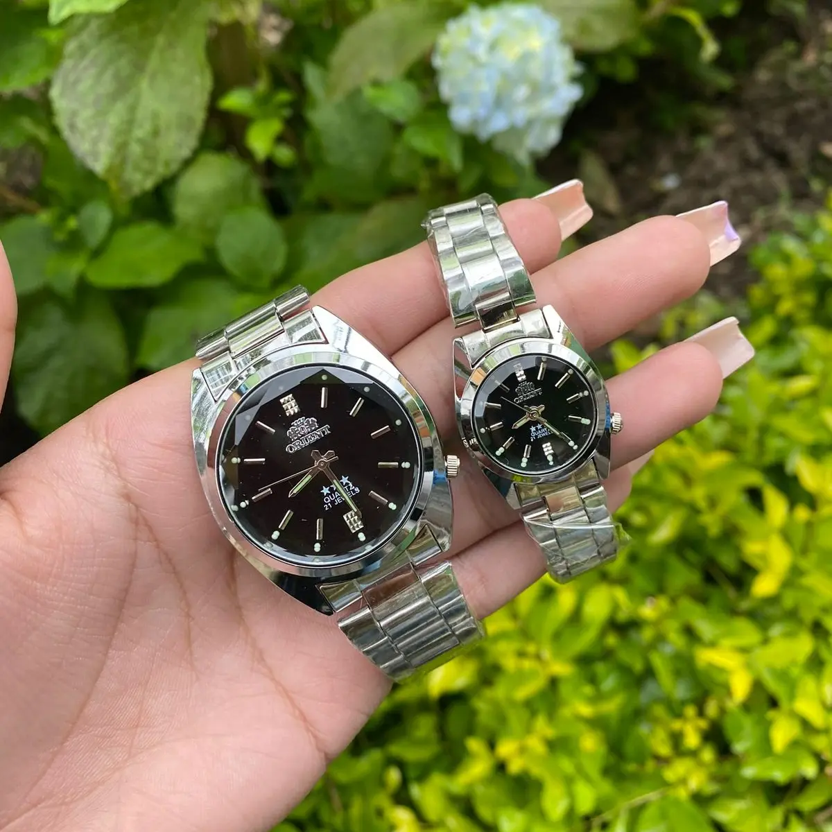 Incluye caja de regalo, tarjeta personalizada, caja para relojes, pareja de relojes replica orient fondo negro, 3 fotos personalizadas, dulces de cortesía, Material: Acero.