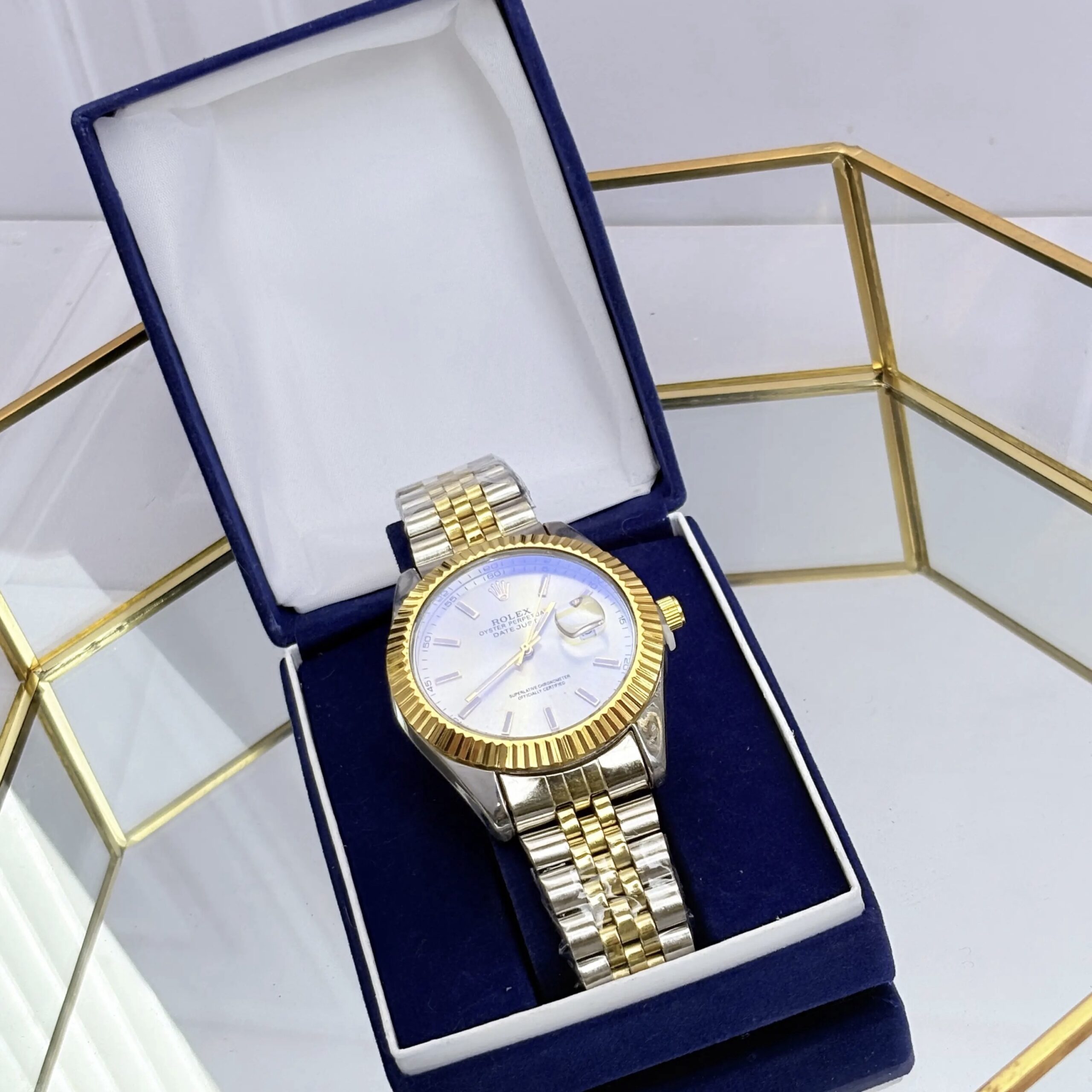 Incluye caja de regalo, tarjeta personalizada, cofre de reloj, reloj réplica Rolex con calendario, dulces de cortesía.