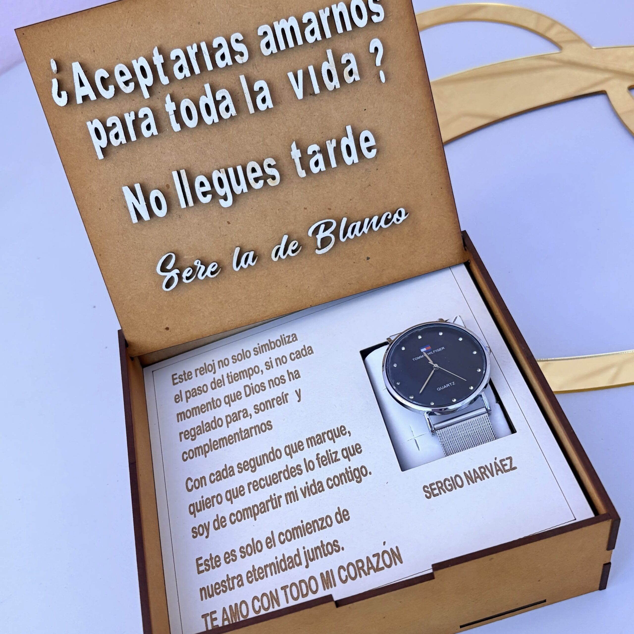 Incluye caja en madera, decoración, frases personalizadas por dentro en madera y talladas, iniciales en madera por fuera, reloj réplica tommy en malla, dos chocolatinas jet mini.
