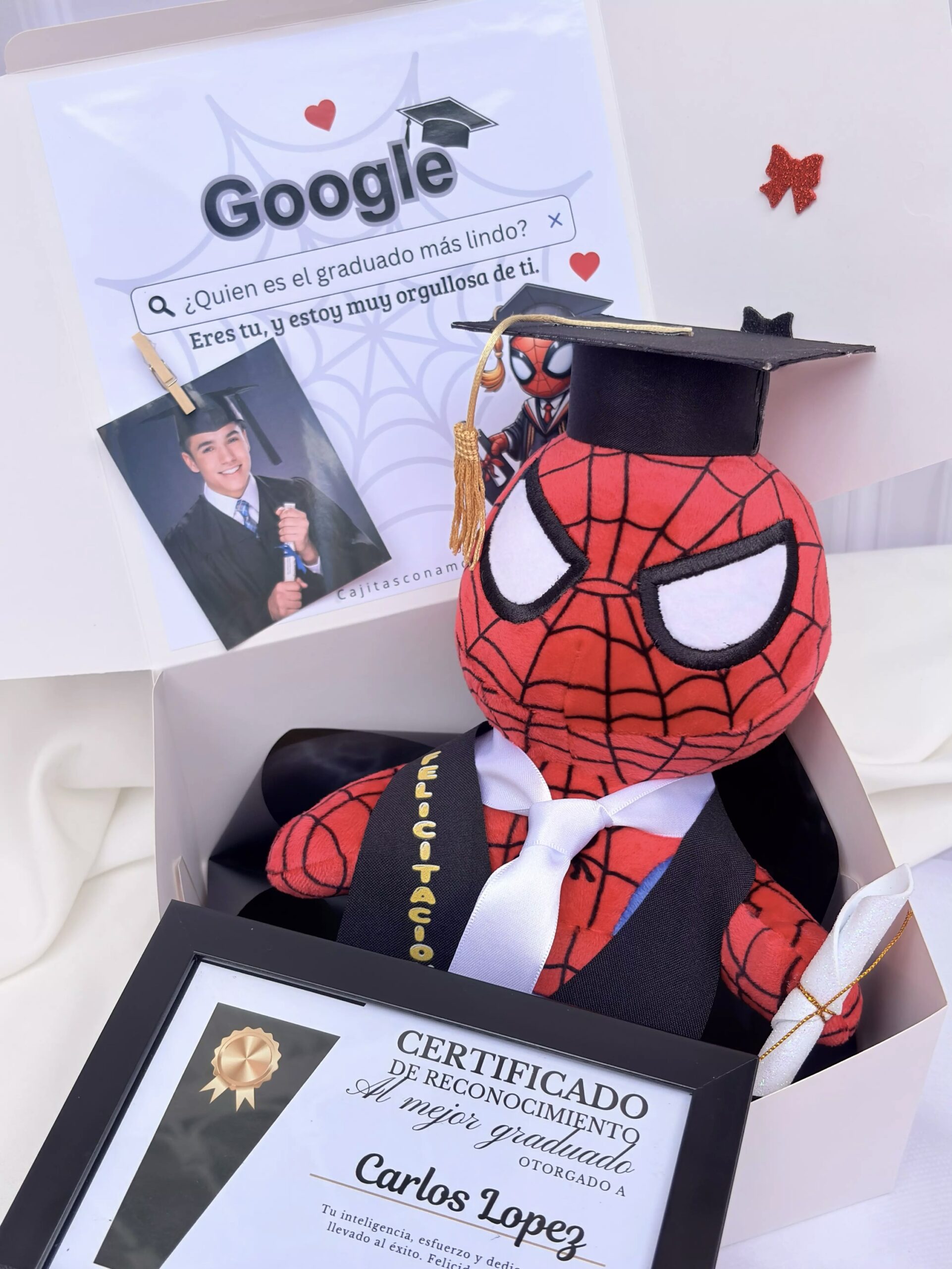 Incluye caja de regalo, decoración, foto personalizada, certificado personalizado con marco, peluche de Spiderman con toga, birrete, diploma y corbata, dulces de cortesía.